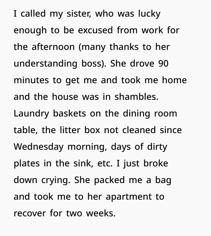 She chose to stay at her sister’s house for more than just the fact that it was clean and comfortable. It was a way to protect yourself. It was a quiet but strong choice for her to get better in a place that felt safe, loving, and emotionally supportive, which is not her present home.
