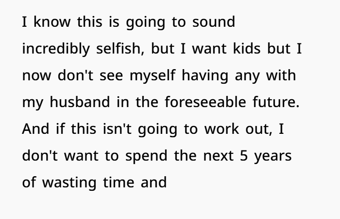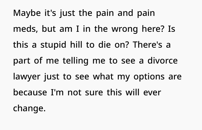It’s not dramatic that she wants to get a divorce; it makes sense. When someone wants to start a family, they also think about whether the place where they live now is safe and caring enough to raise children. As a possible co-parent, a partner who disappears during surgery and doesn’t take care of basic needs doesn’t make you feel good.