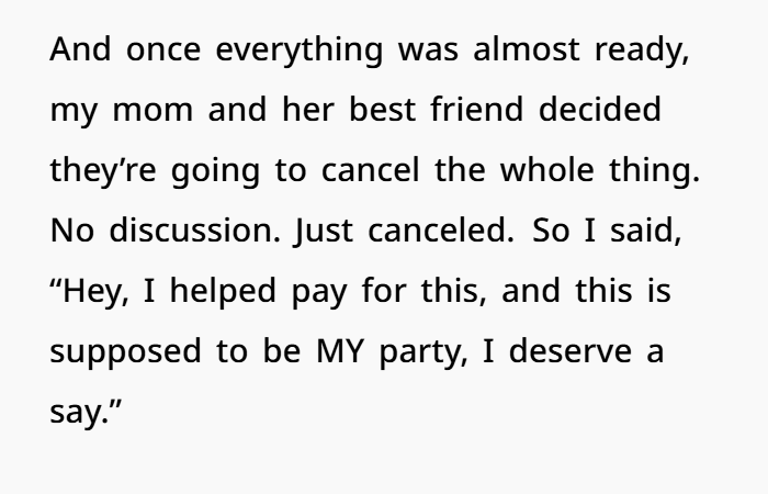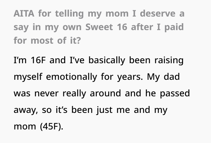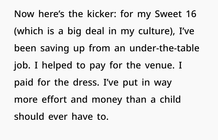 A 16-year-old girl has been dealing with an emotionally abusive home for years, depending on her own skills to stay stable. After working a job that didn’t pay well to save money, she helped plan and pay for her Sweet 16 party, which was a big cultural event that should have celebrated her growth. But right before the event, her mother and her mother’s bossy best friend agreed to cancel it all without telling anyone or talking about it.