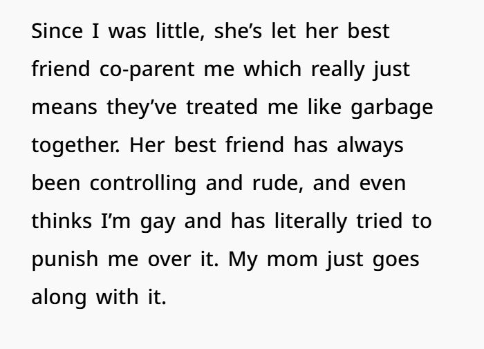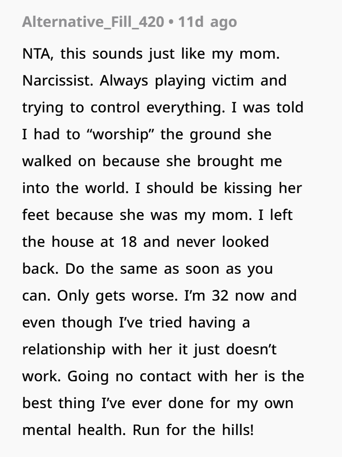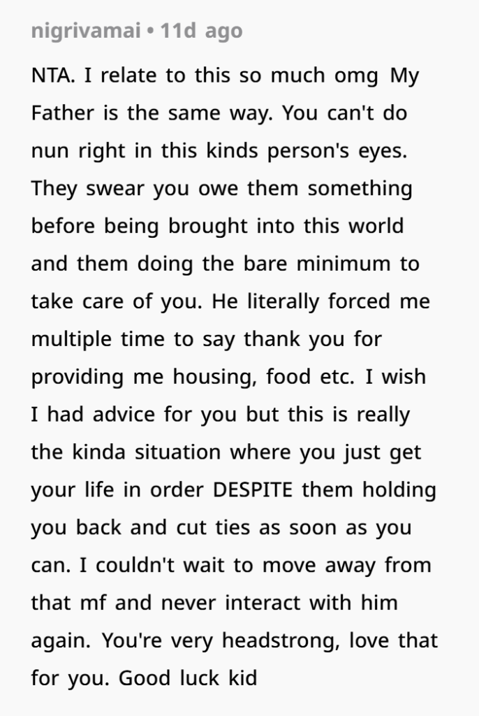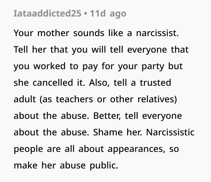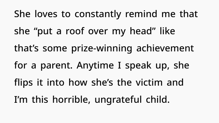 Instead of shielding her daughter from this mean behaviour, the mother encouraged it, maybe to take the focus off of the things she did wrong. Calling a child “ungrateful” is easier than having to think about years of mental neglect and a pattern of gaslighting. Parents who constantly see their basic responsibilities, like feeding and housing their children, as huge sacrifices are showing that they are emotionally immature and not good parents.