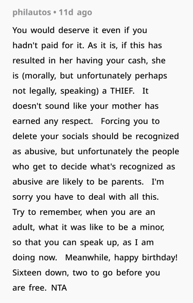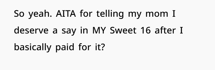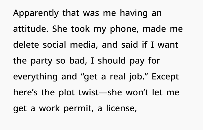 When the teen said she should have a say in a party she helped plan and pay for, her mother told her she wasn’t grateful, took away her phone rights, and said she had a “attitude.” Even though she wouldn’t let her get a licence or permit to officially work, her mother made fun of her for trying to plan her own future. Today, this girl is asking the internet if she’s really wrong or if she’s just sick of being punished for being strong and independent.