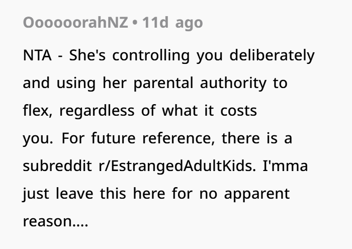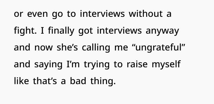 It’s even worse in this case because the mother is actively blocking her daughter’s way to independence. She was not given a work pass, was not helped in getting a driver’s license, and was not even allowed to go to job interviews, but she was told to “get a real job.” This is a harmful cycle that keeps happening. It’s a type of gatekeeping, where a parent keeps their child from getting to chances on purpose to stay in charge.