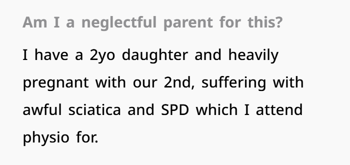 A heavily pregnant mother of a two-year-old started a huge debate online when she talked about how she deals with the pain of her pregnancy by taking a 30-minute bath once or twice a week. With safety measures in place, like locked doors, medicine cabinets and Peppa Pig on the TV, she felt good about letting her baby play alone in their safe apartment. But her mother-in-law called the process “neglectful,” which has made her feel bad and make her question whether she’s doing the right thing.