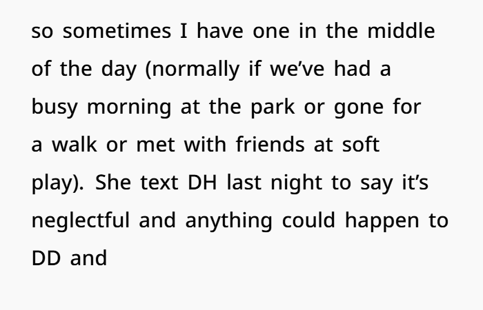 The most hurtful thing about the claim is not that it was made, but that it was sent as a text message to the poster’s husband instead of in person. Going around the mom to the dad is a common sign that there are boundary problems in in-law relationships. Instead of bringing up a worry out of kindness or interest, the MIL turned it into a weapon by calling it neglect without giving any background or nuance.